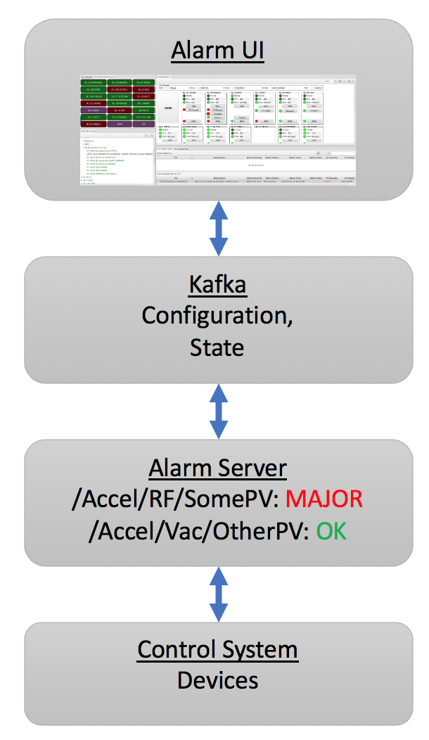 Kafka stores the alarm system configuration, and provides the communication bus between the alarm server and user interface.