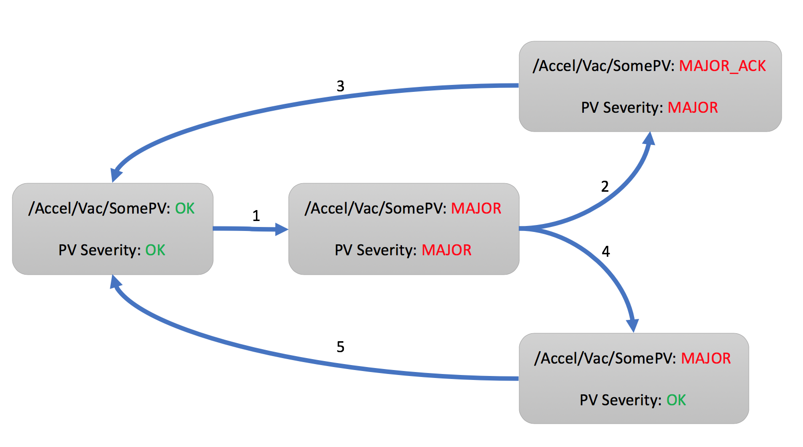 Typically, the alarm will persist for a while. A user acknowledges the alarm (2) and starts to address the underlying issue. Eventually, the reason for the alarm is removed, the severity of the PV recovers to OK, and the alarm system returns to an overall OK state (3).