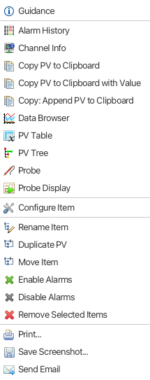 Note that the alarm system reacts to PVs. Details of how PVs generate alarms, for example at which threshold an analog reading would enter a MINOR alarm state are determined in the control system. The alarm system can notify users of an alarm, but it cannot explain why the alarm happened and what the user should do. Each alarm should be configured with at least one “guidance” message to explain the alarm and a “display” link to a related control system screen.